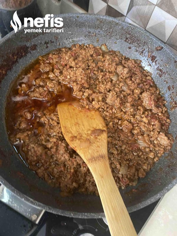 - Borcamın en altını kaplayacak biçimde dizilir üstüne kıymalı harç konur.