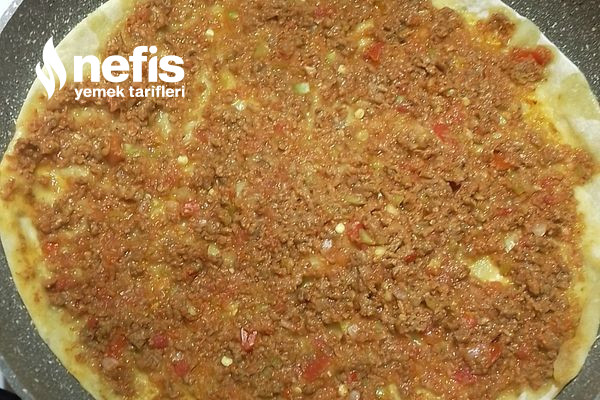 7. Önceden altını açmış olduğunuz teflon tavaya lahmacunu alıp pişmeye bırakın.