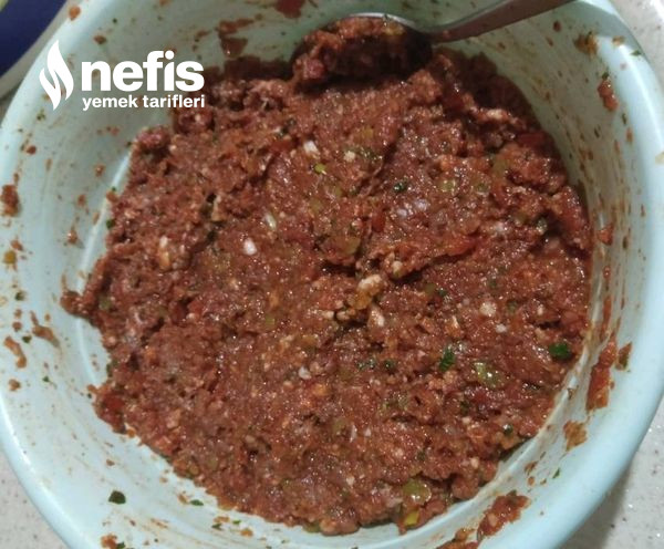 2. Geçirdiğimiz materyalleri kabımızın içine alıp, kıyma, sıvı yağ ve baharatlarımızı döküp karıştırıyoruz ve buz dolabında biraz dinlendiriyoruz.