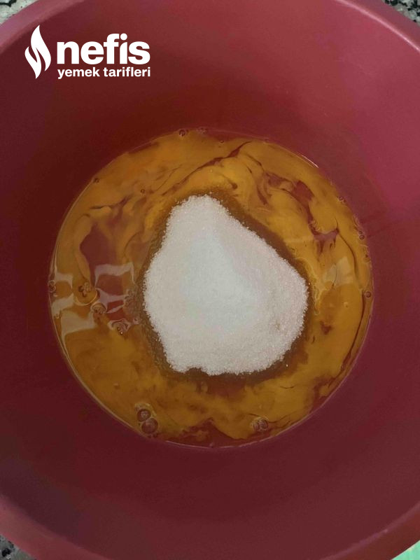- Karıştırma kabına yumurta ve şekeri alıp beyaz köpük köpük olana kadar çırpalım ve ılık su koyalım.