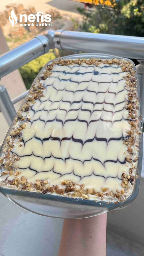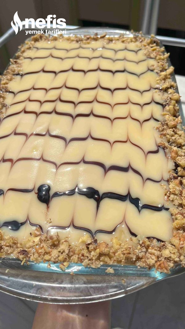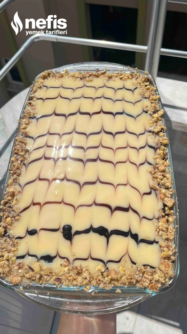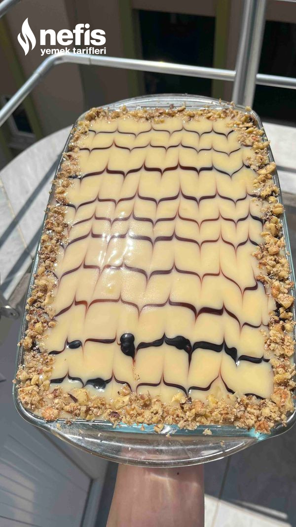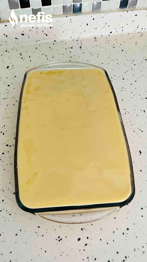 - Ocağa alınıp muhallebili kıvamı olana kadar pişirilir, pişen krema soğumaya bırakılır, soğuduktan sonra toz kremşanti eklenir mikserle çırpılır.