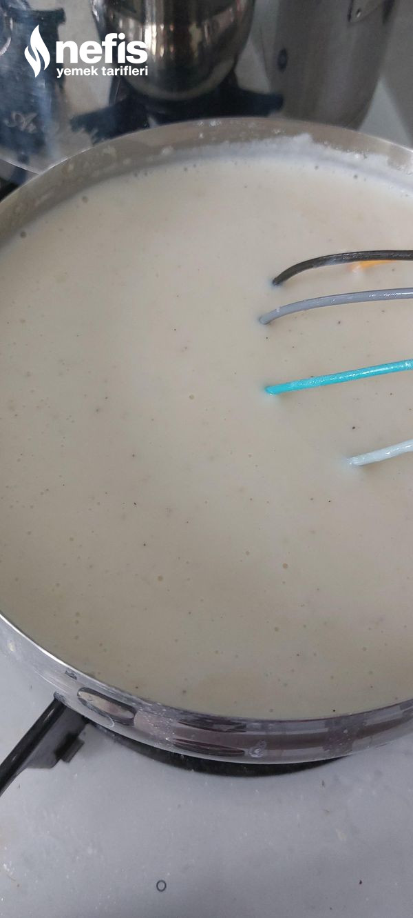 - İç harcımızı pişerken biz beşamel sosu hazırlıyoruz tereyağı ve unu tencereye ekliyoruz un kokusu çıkana kadar kavuruyoruz ve sütümüzü ekliyoruz bir taşım kaynatıyoruz içerisine biraz da tuz ekiliyoruz.