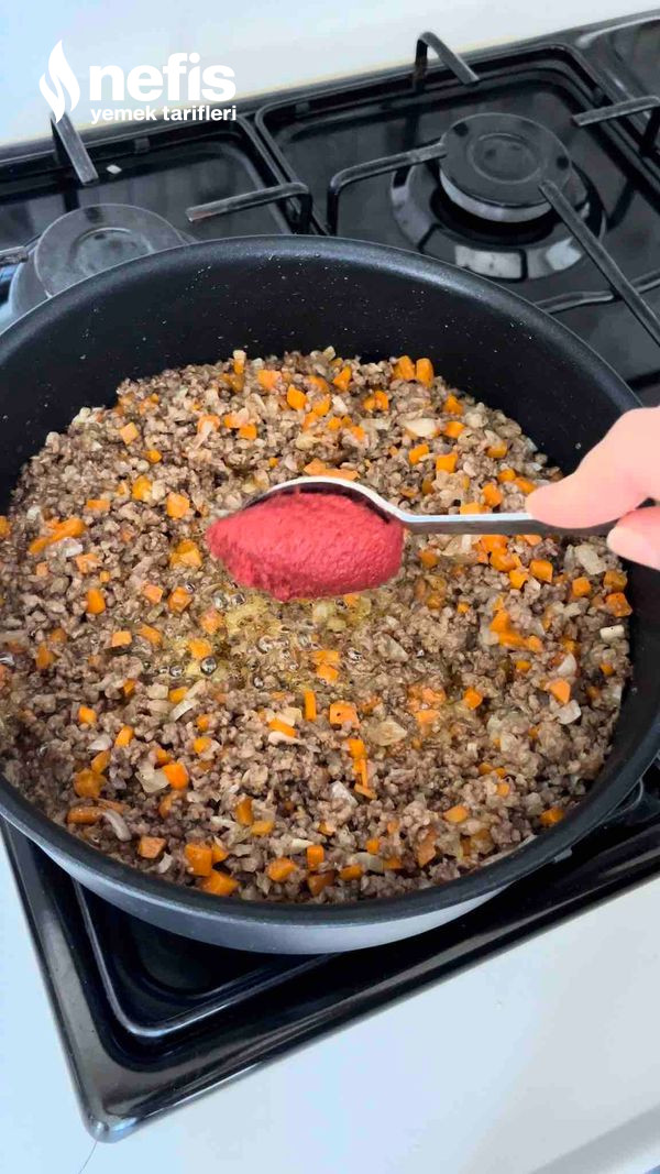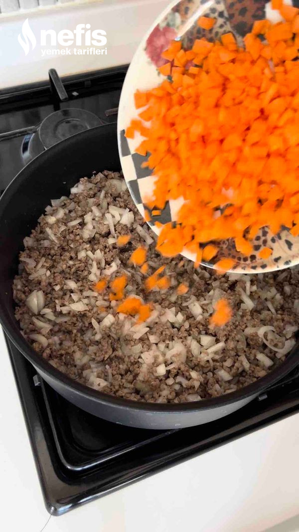 - Kıyma kavrulduktan sonra evvel küp küp doğradığımız soğanı daha sonra yeniden minik küp küp olacak formda doğradığımız havucu ekleyelim.