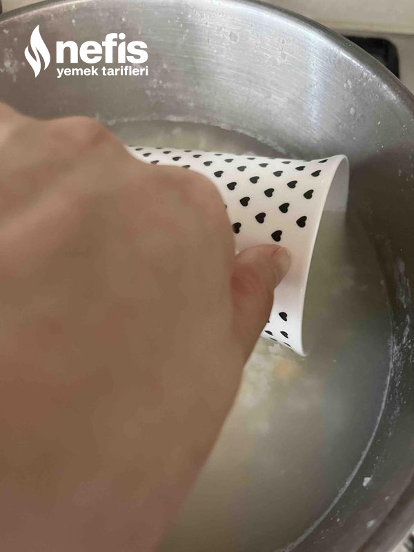 6. Pişen pirinçlerin suyundan bir kepçe alıp, yoğurda ekleyelim ve karıştıralım. (çorbamızın kesilmemesi için bu süreci yapıyoruz).