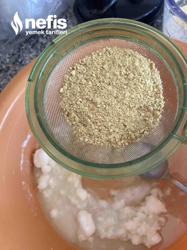 2. Daha sonra 2 su bardağı leblebiyi rondadan geçirelim, çekilen leblebiler toz haline geliyor tozu elekten geçirerek yağ ve pudra şekerin içine katalım.