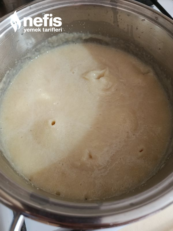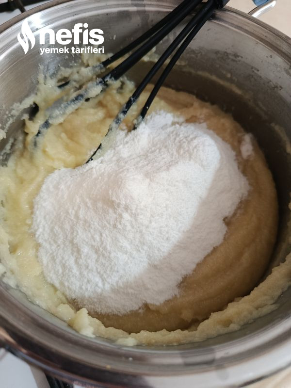 2. İlk sıcağı çıktıktan sonra krem şantiyi (toz halde) muhallebimize ek edelim güzelce karıştıralım.