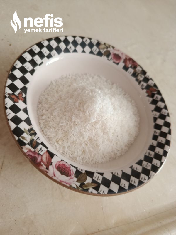 3. Genişçe bir kaseye hindistan cevizimizi dökelim.