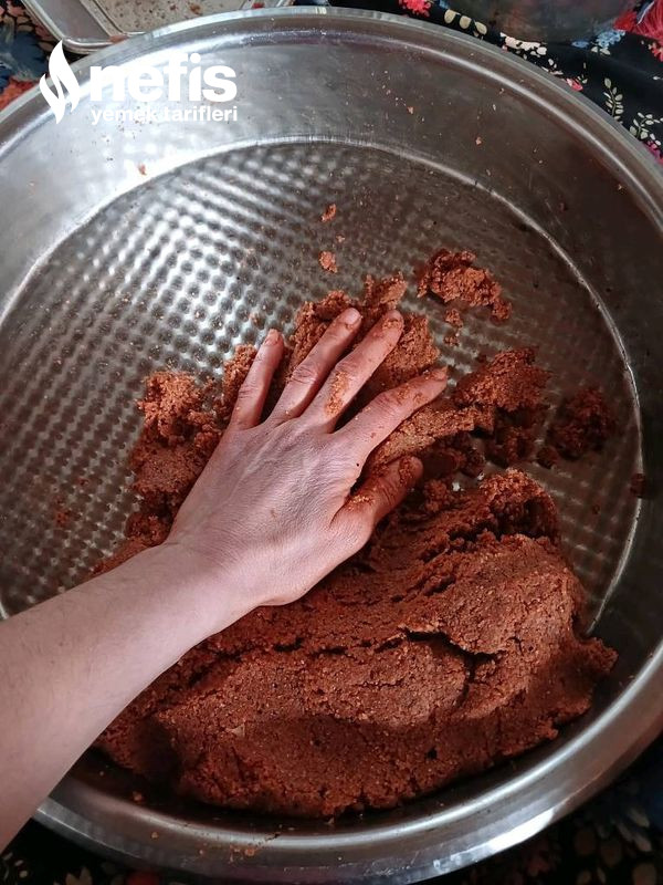 - İçine hazırladığımız limon suyu ,zeytinyağı,isot ,nar ekşisi karışımı koyup yoğuruyoruz.