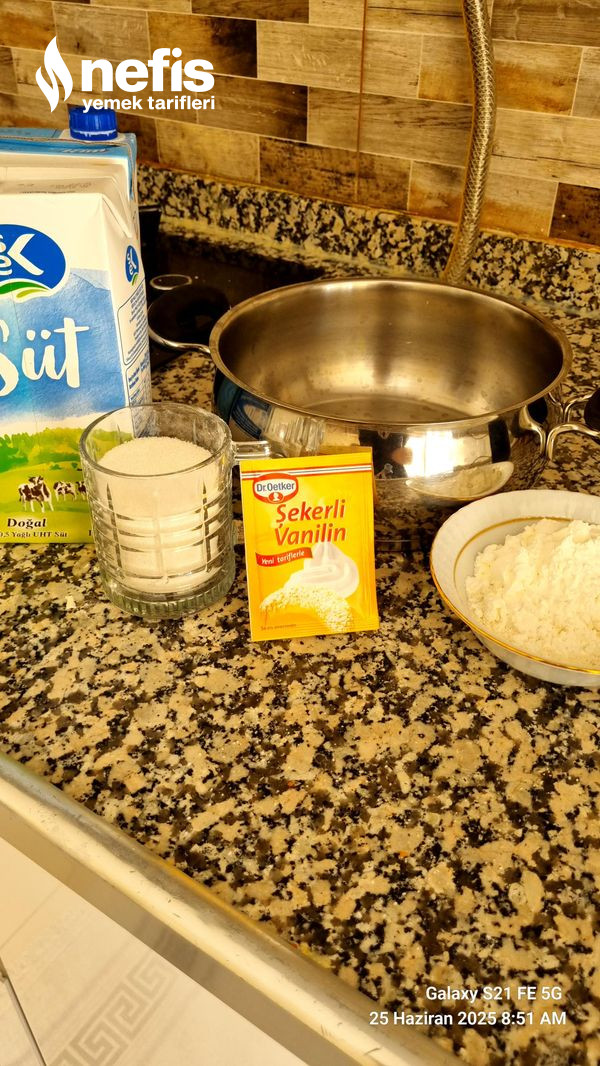 5. Kaynayan muhallebiye vanilin ekleyip altını kapatıyoruz ,vaktiniz yoksa krem santiyi sıcakken ek edebilirsiniz yeterlice karıştırıp kekin üzerine döküyoruz ve soğumaya bırakıyoruz.