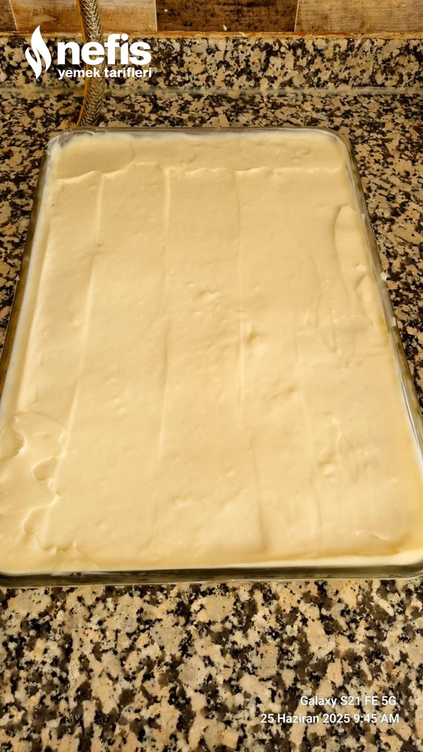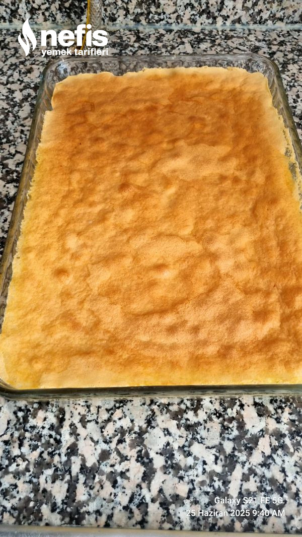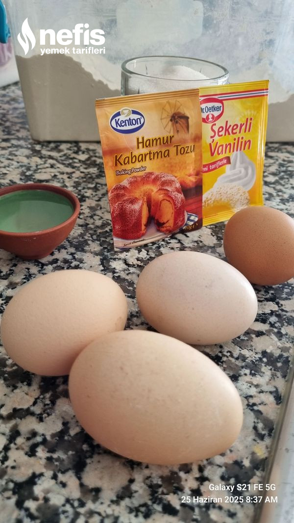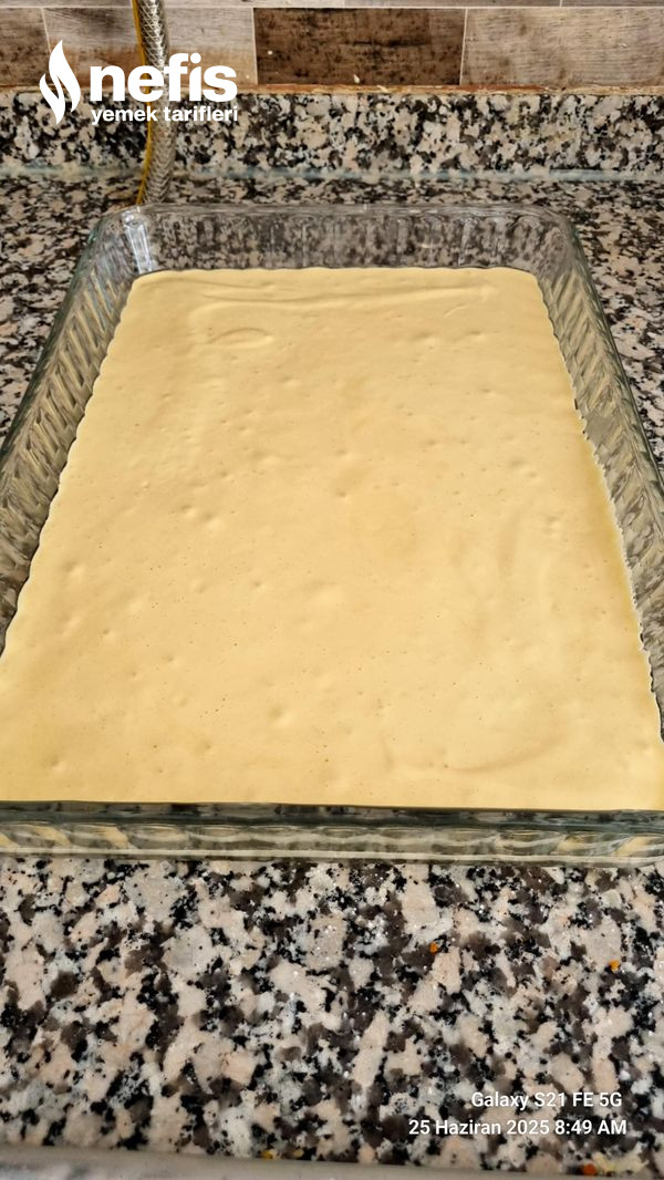 3. Hemen akabinde un kabartma tozu vanilya ekleyip düzgünce çırpıyoruz yağladığımız dikdörtgen borcama harcımızı döküyoruz 180°’de alt üst pişmeye bırakıyoruz.