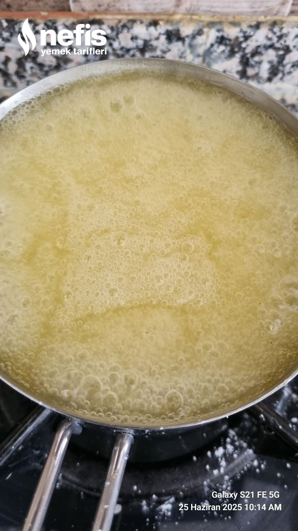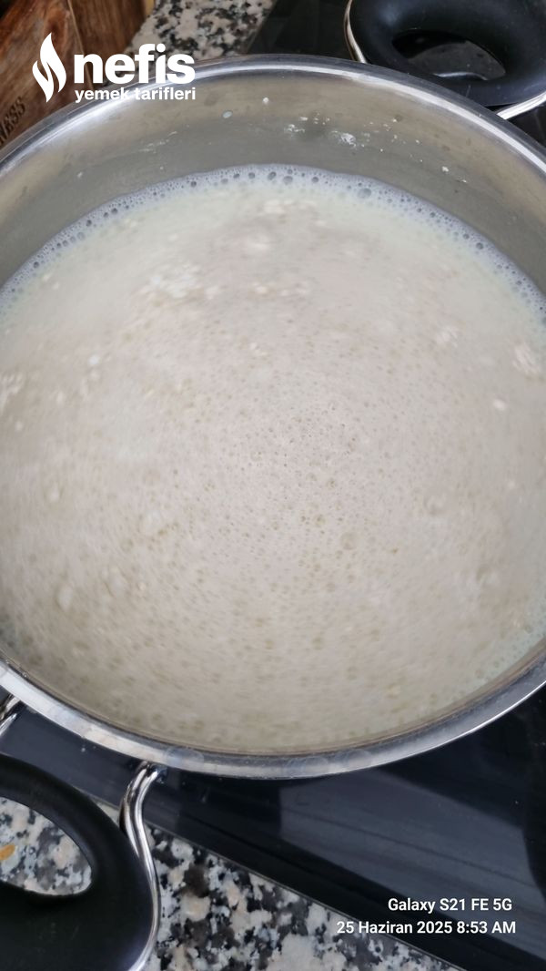 6. Sos için tüm gereçleri tencerede kaynattıktan sonra pişince birinci sıcağı çıktıktan sonra soğumuş olan muhallebinin üzerine döküyoruz.