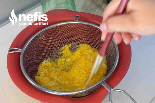- Geniş bir kap alalım ve üzerine süzgeç koyup karışımı dökelim.