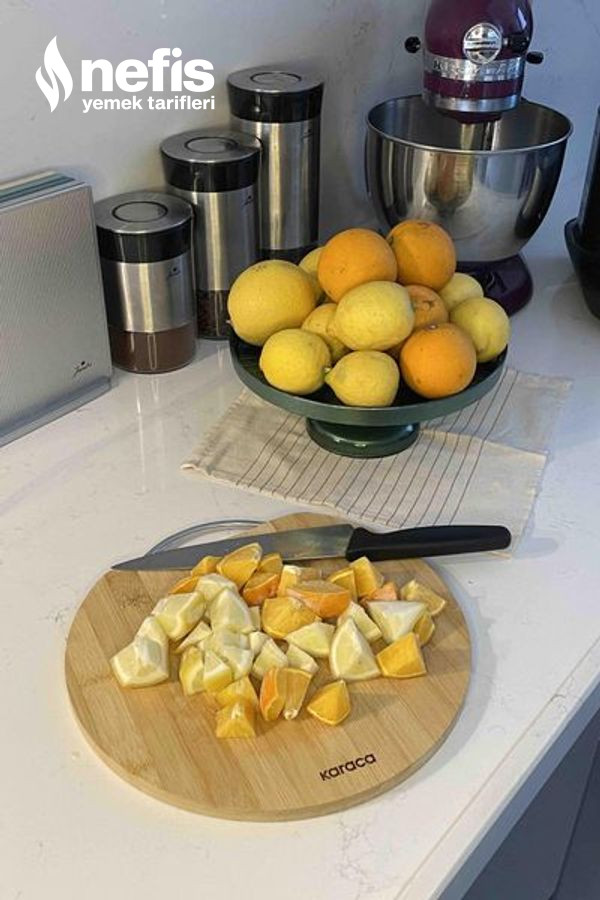 - 1 gece öncesi derin dondurucuda beklettiğimiz limon ve portakalı küp formunda doğrayalım.