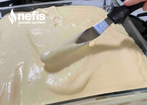 - Küçük kare borcamın tabanına sütle ıslattığımız kedidillerini dizelim ve kremanın yarısını üzerine yayalım.