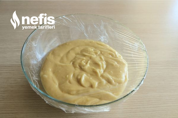 4. Un, kabartma tozu, bir çimdik tuzu koyup karıştıralım. Yumuşak ve yapışan bir hamur olacak. Üzerini streçle kapatalım.