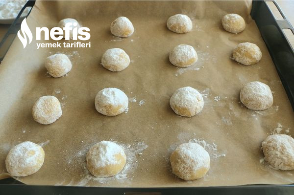 5. Buzdolabında 2 saat  bekletelim. Yuvarlak hal verip evvel toz şekere sonra pudra şekerine bulayıp tepsiye aralıklı olarak koyalım.