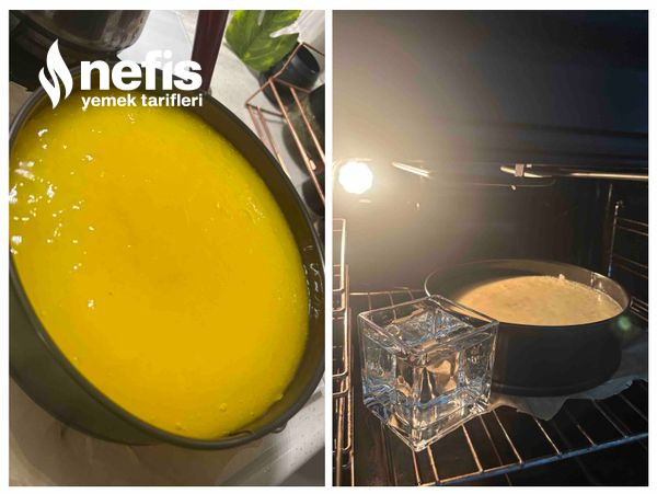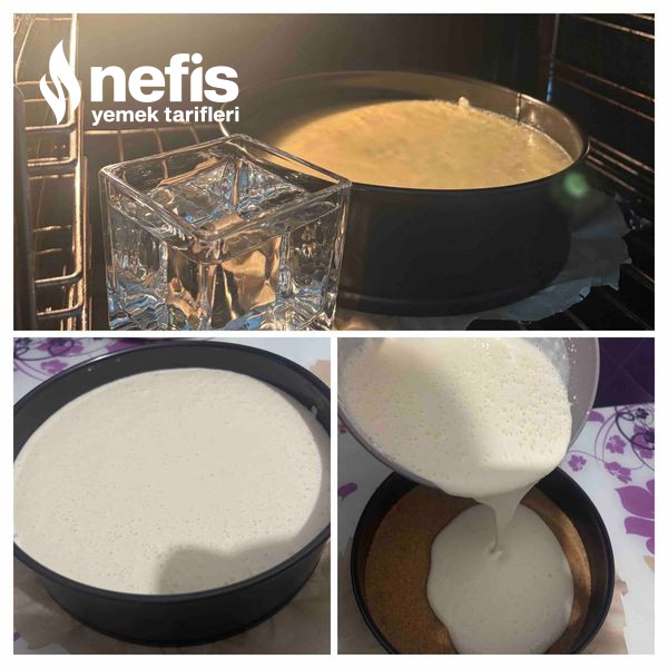6. Daha evvelce ısıtılmış 160° fansız ayarda fırınımıza koyuyoruz yanına da ısıya güçlü bir kaba su koyalım ki cheescakeimiz çatlamasın.