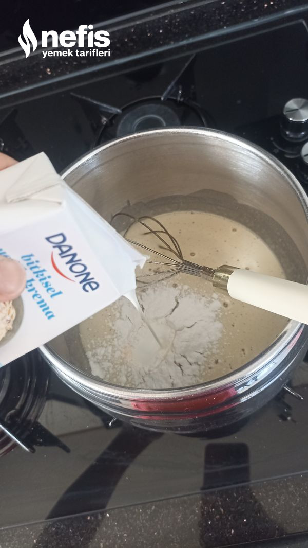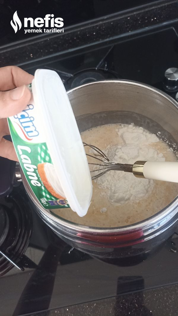 - Yumurtalı karışımı bir tencereye alıp üzerine suyunu süzdüğümüz labneyi, sıvı kremayı, vanilya ve dolu dolu 3 yemek kaşığı nişastayı ekleyip güzelce karıştıralım.