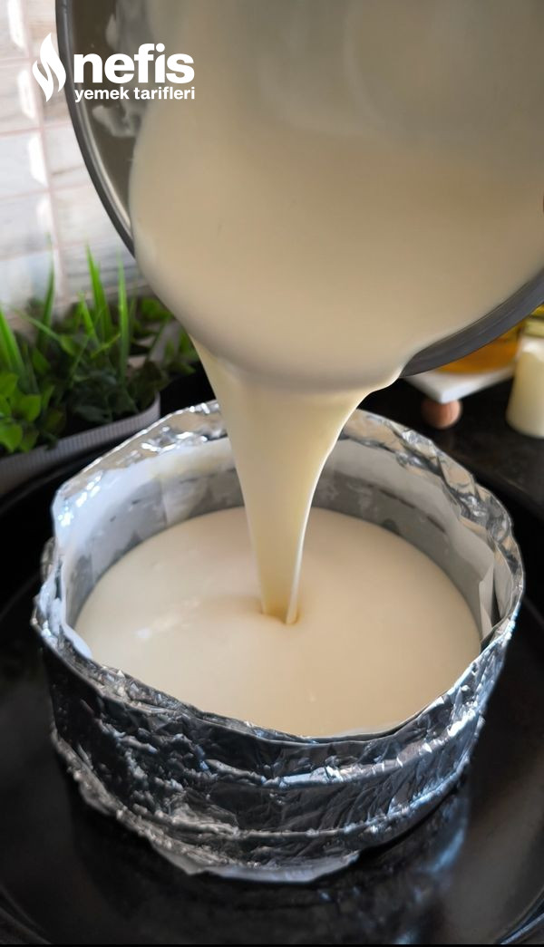 - Kalıbın dışını alüminyum folyo ile iki kat olacak formda sarın. Labne ve şekeri güzelce çırpıp kremayı ekleyin çırpın. Yumurtaları teker teker ekleyip çırpın.