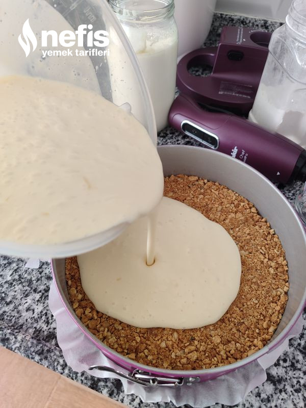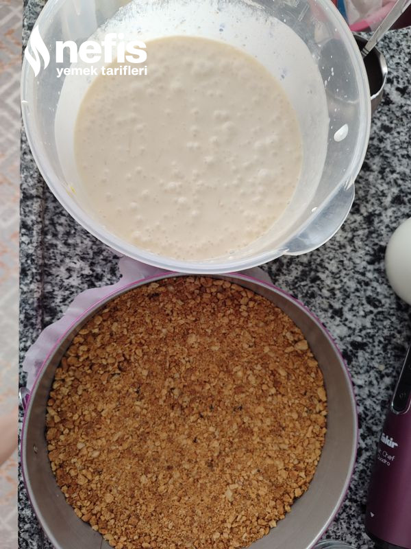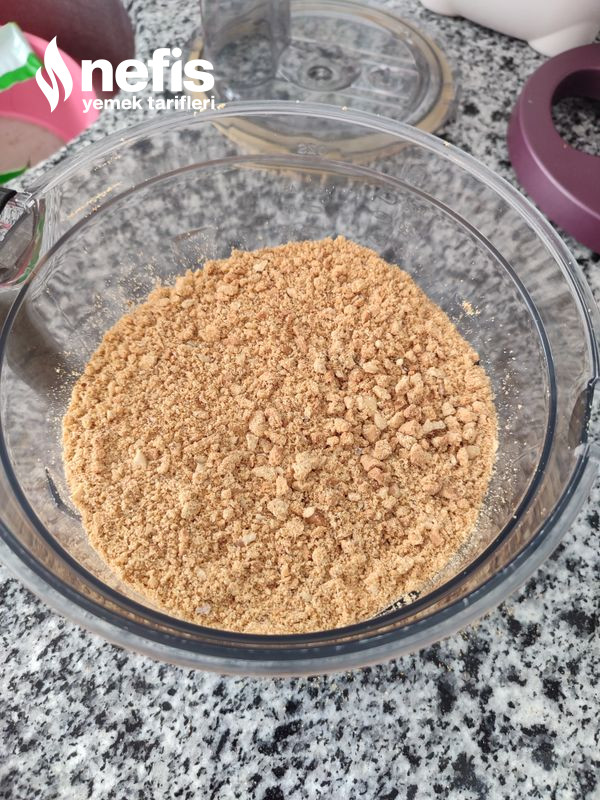 - Önce bisküvileri ve cevizi robottan çektim çekilen bisküvilerin içerisine erittiğim tereyağını ekledim güzelce karıştırıp, yağlı kağıt koyduğum kelepçeli kalıbın içerisine yaydım ve bir bardak yardımı ile düz bir taban olacak formda bastırdım ve dolaba koydum.