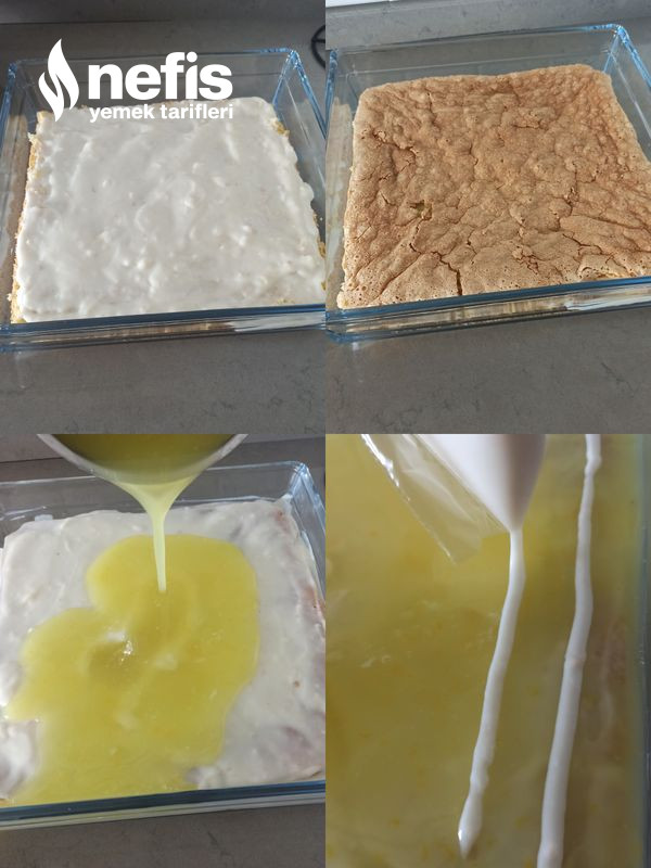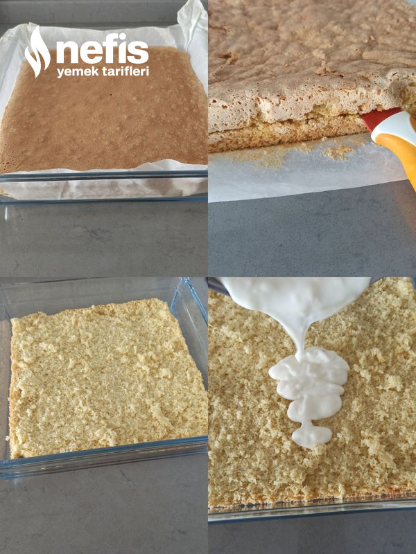 - Kremanın yarısını dökelim ve öteki keki yerleştirelim, tekrar kremamızı döküp dinlenmeye bırakalım.