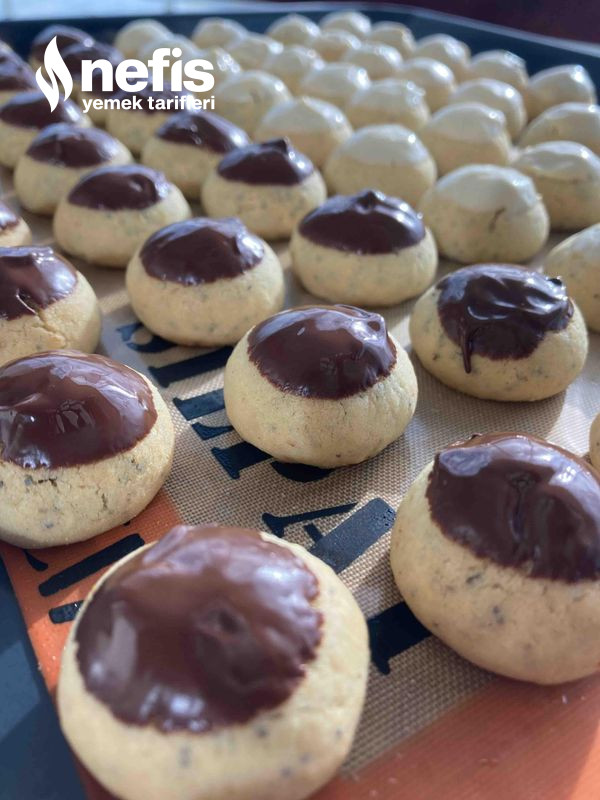 8. Kurabiyelerimizi erittiğimiz çikolataya hafif batırıp tepsiye koyalım, buzdolabında 5 dakika bekletip donmasını bekleyelim. Dilerseniz sadede yapabilirsiniz. Afiyet olsun 🥰👍.