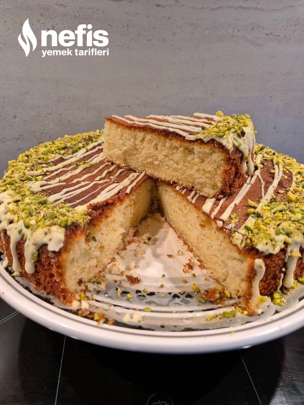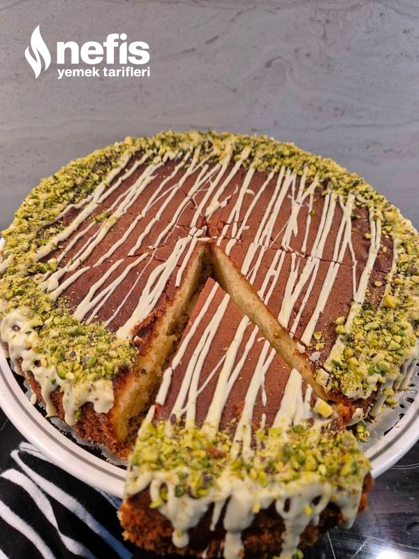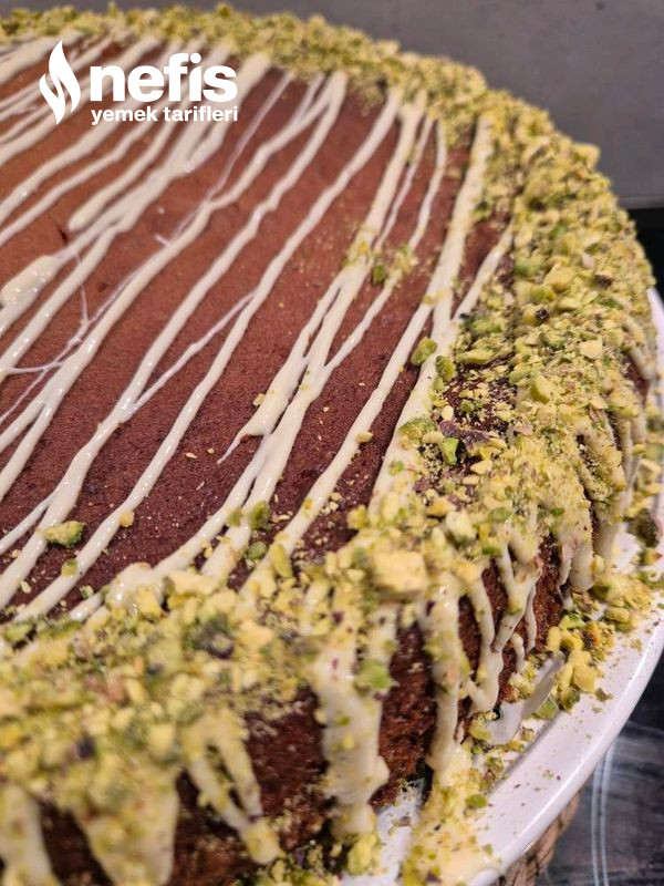7. Kek soğuduktan sonra üzerini benmari yolu erittiğimiz beyaz çikolatayla ve antep fıstıklarıyla süslüyoruz. Deneyecek olanlara afiyet olsun.