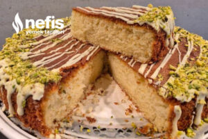 7. Kek soğuduktan sonra üzerini benmari yolu erittiğimiz beyaz çikolatayla ve antep fıstıklarıyla süslüyoruz. Deneyecek olanlara afiyet olsun.