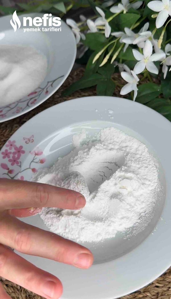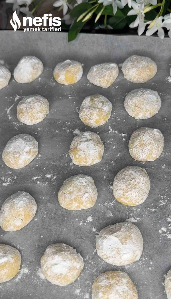 3. Dondurucudan aldığımız hamura form vermeye başlıyoruz. Elimizle ceviz büyüklüğünde yuvarlayarak evvel şekere daha sonra pudra şekerine bandırıyoruz ve tepsiye diziyoruz.