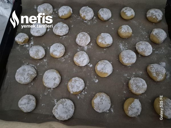 - Ceviz büyüklüğünde kesimler koparıp pudra şekerine bulayıp tepsiye dizelim.