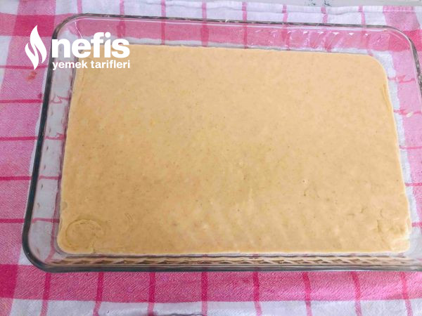 7. Dikdörtgen borcamı yağlayalım, hazırladığımız hamuru tepsiye yayalım ve 180 derece fırına atalım.