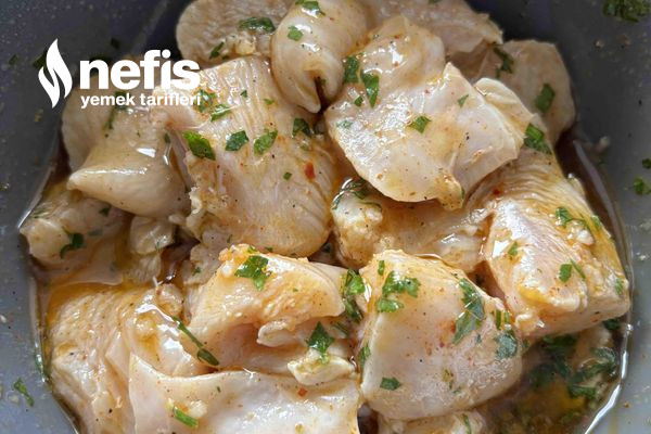 - Kuşbaşı tavuk etlerinin üzerine yağlı karışımı dökelim ve güzelce karıştırıp vaktiniz varsa üzerini streç sinemayla kapatıp iki saat buzdolabında kesinlikle bekletmenizi öneririm.