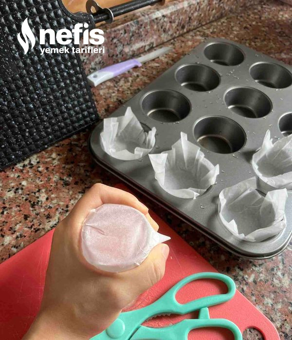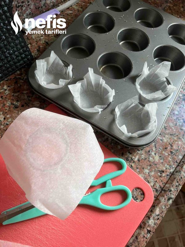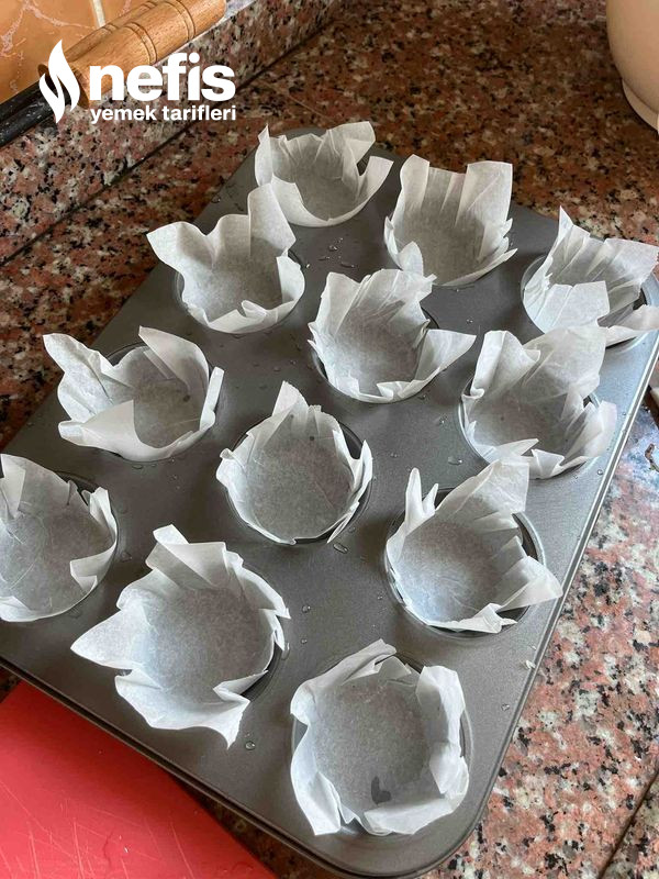 - Karışım, ister tek kullanımlık muffin kağıtlarının yerleştirildiği muffin kalıbına ister de yağlı fırın kağıdını 12 eş kesime bölüp her bir modül kağıdı su bardağının aksine koyup avuçladıktan sonra muffin kalıbına eşit biçimde paylaştırılır.