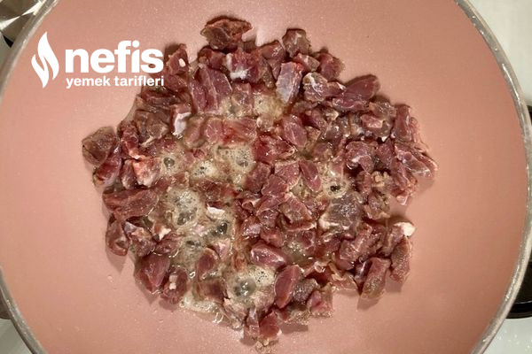 - Küçük doğranmış kuşbaşı etlerimiz sıvı yağ koyduğumuz tavada suyunu salıp çekene kadar kavuralım.