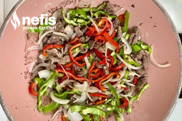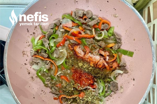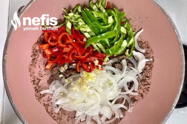 - Sonra uzun ince doğradığımız kapya ve yeşil biberi, halka halka doğradığımız kuru soğanı ve rendelenmiş sarımsağı etin üzerine ekleyelim.