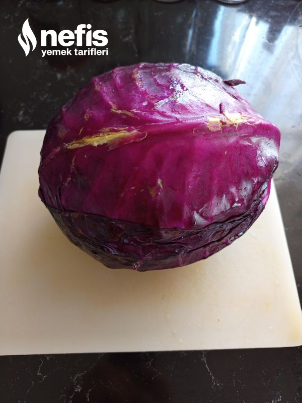 1. Öncelikle yıkadığımız makus yapraklarını temizlediğimiz mor lahanayı salata tahtasına alalım.