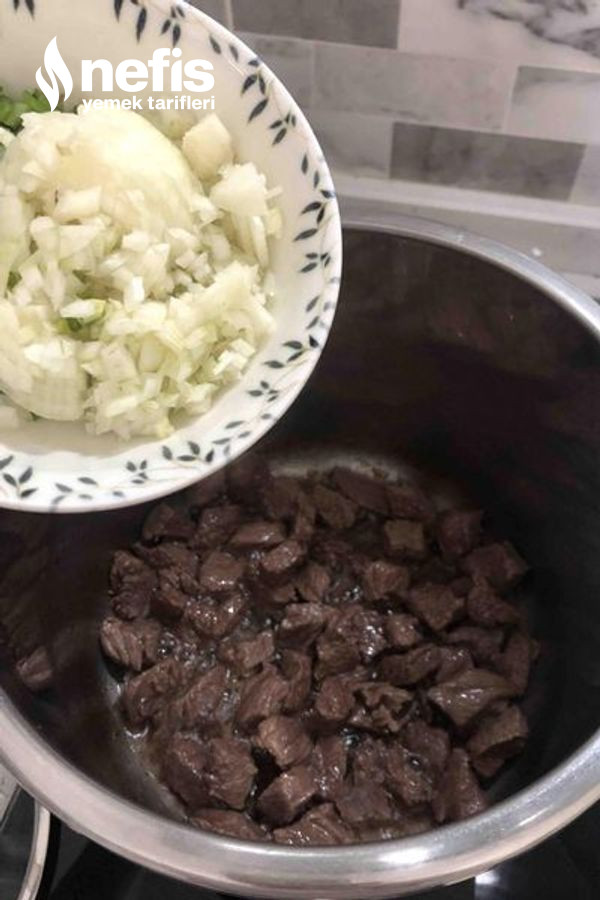 2. Tencerede yağları eritin ve iri kuşbaşı doğranmış etleri mühürleyin.