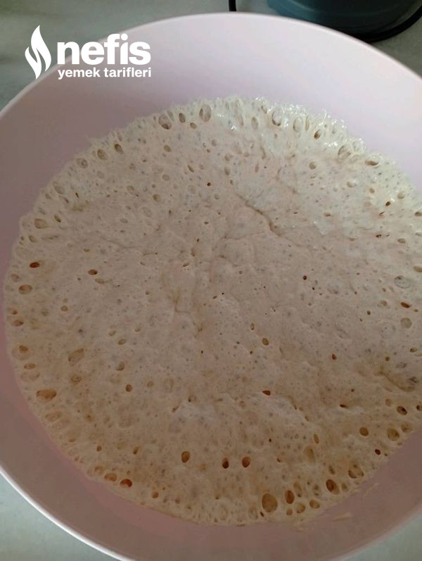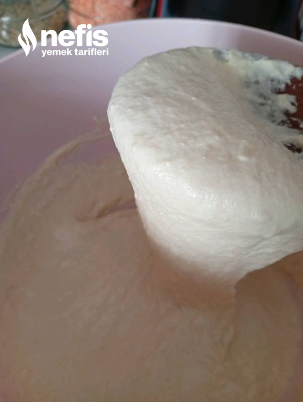 2. Hamur için; kuru gereçler karıştırılır. Yavaş yavaş su eklenerek sıvı bir hamur elde edilir. Üzeri kapatılıp 40 dk mayalanması için bırakılır.