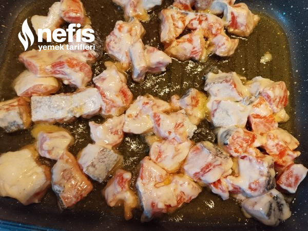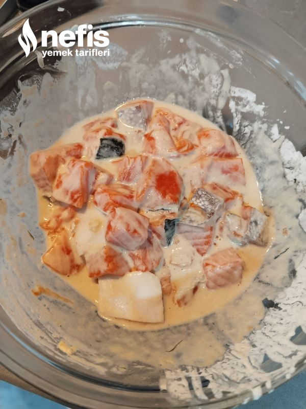 2. Küp küp doğranan somon baliklar karışıma bulanır.