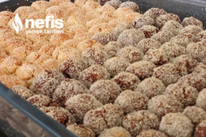 - Yağladığımız fırın tepsisine küçük küçük hamur alıp yuvarladıktan sonra irmiğe bulayıp koyuyoruz.
