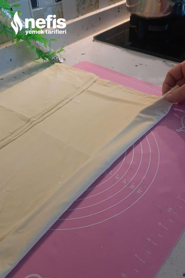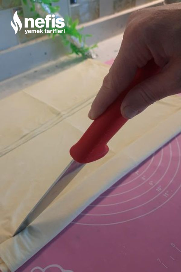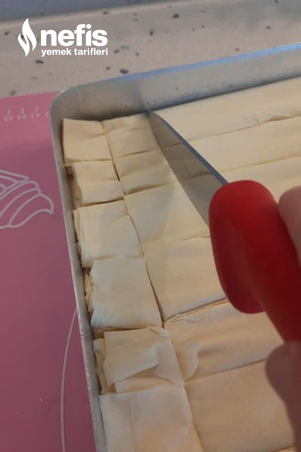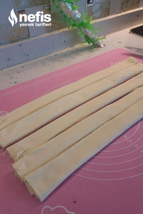 1. Yirmi tane yufkamızı açıp uzunlamasına ikiye katlayıp 1cm eninde kesiyoruz.
