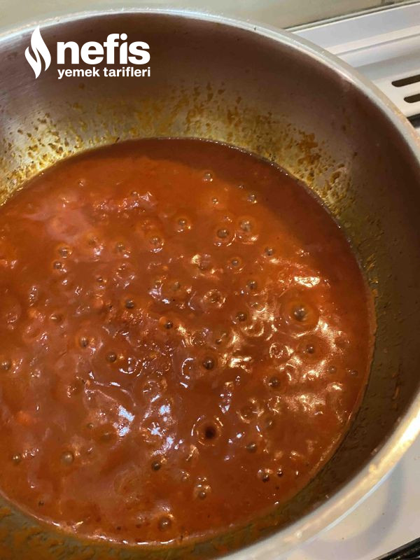 5. Domates sosu,biraz şekeri tuz ve karabiberi de koyalım biraz da sıcak su ekleyip pişirelim.