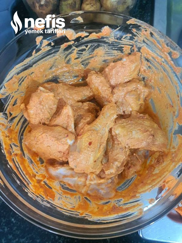 - Öncelikle yoğurt,zeytinyağı, baharatlar, salçalar ,sarımsak ve limon suyu hepsini büyük bir kaba alıp karıştırıyoruz.