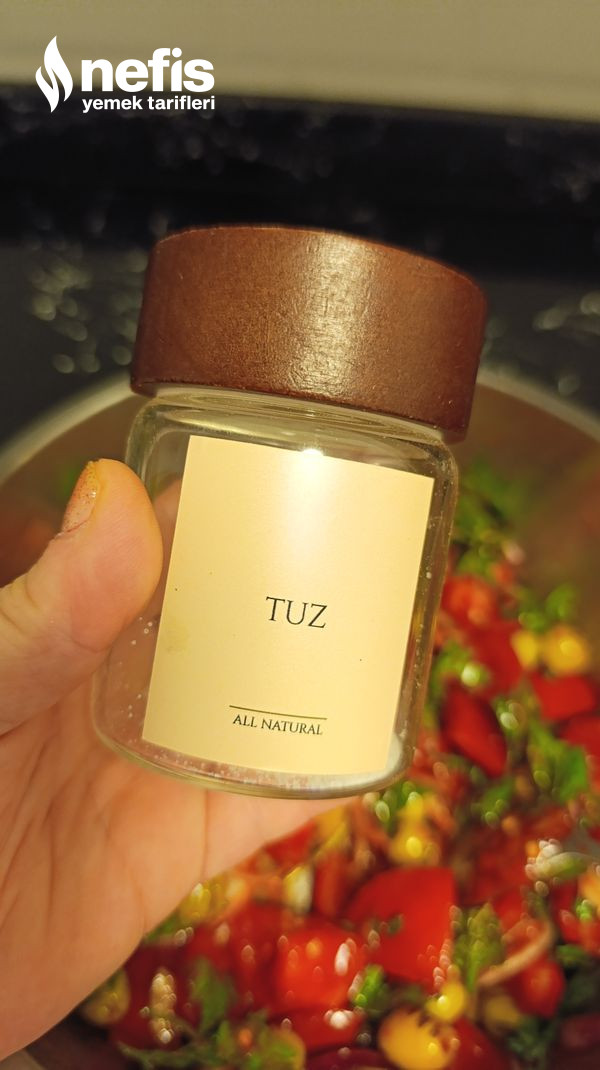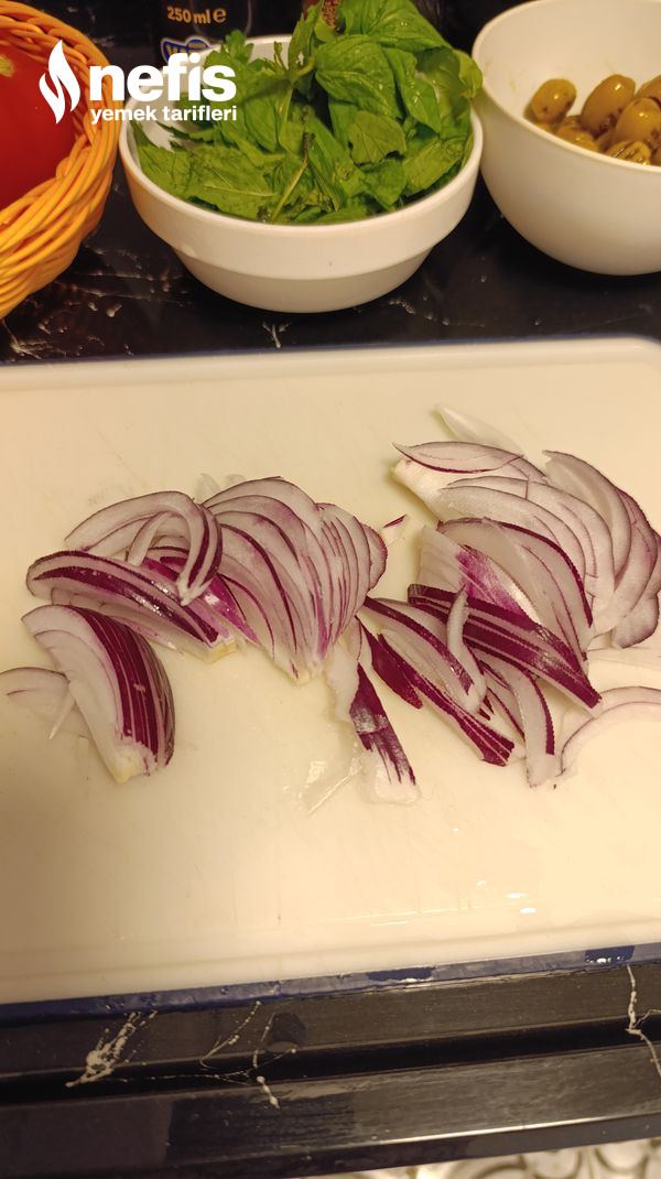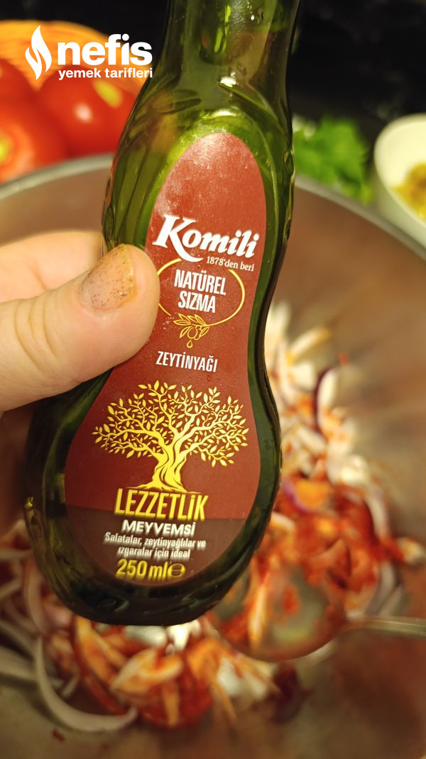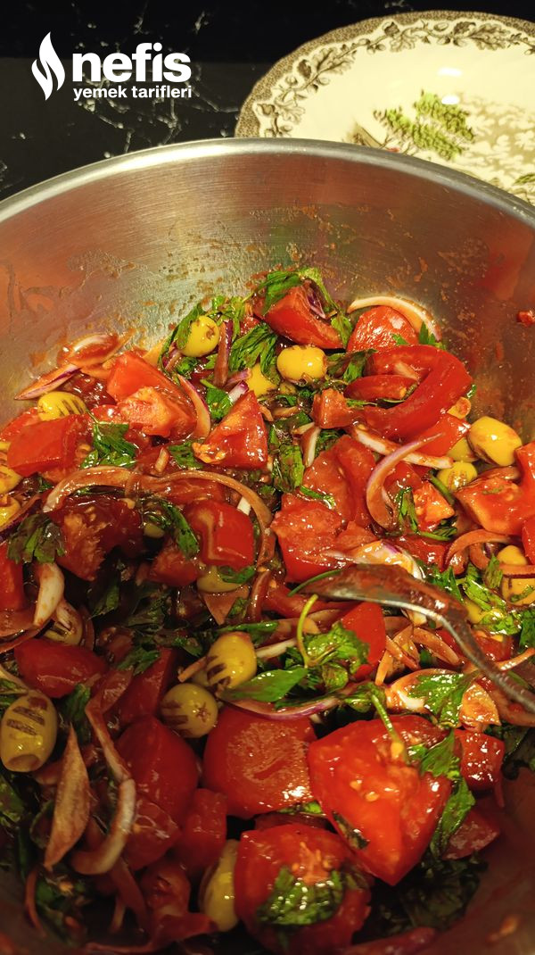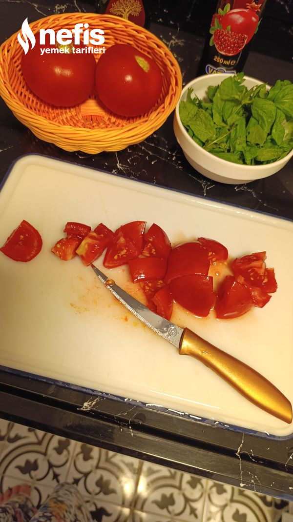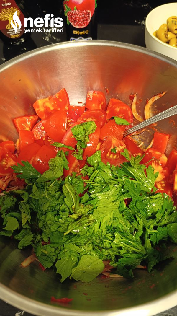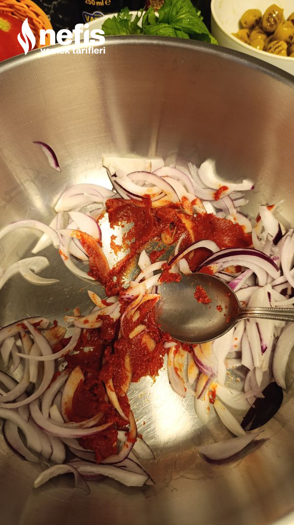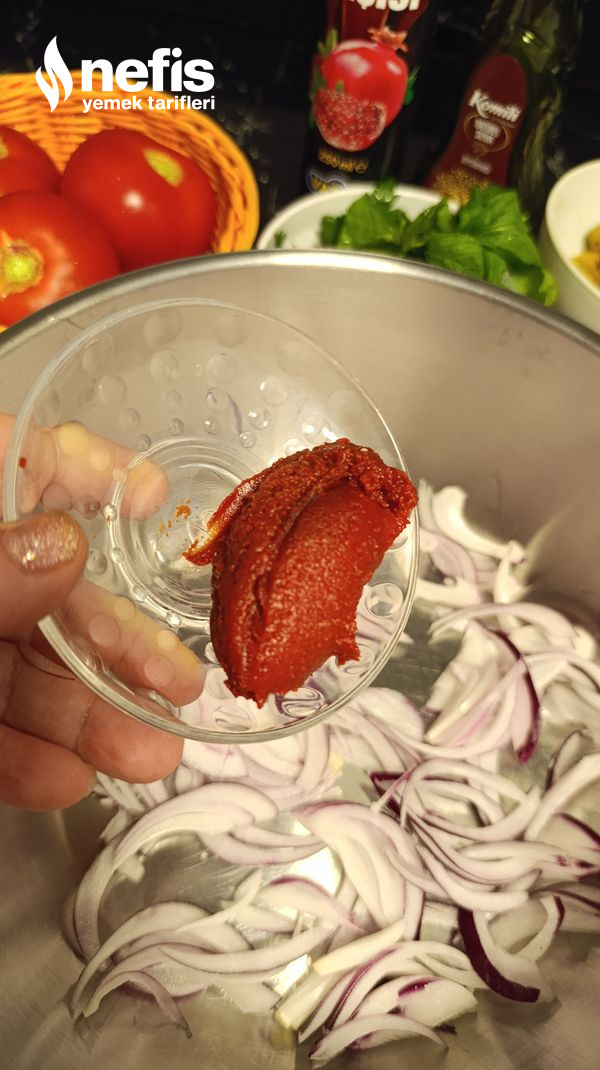 - Kuru soğanı ince kıyıyoruz. Derin bir kaba alıyoruz. Üzerine salça ve 1 yemek kaşığı zeytinyağınıda ekleyip eziyoruz. Domatesleri iri doğruyoruz. Nane ve maydanozuda iri kıyıyoruz.