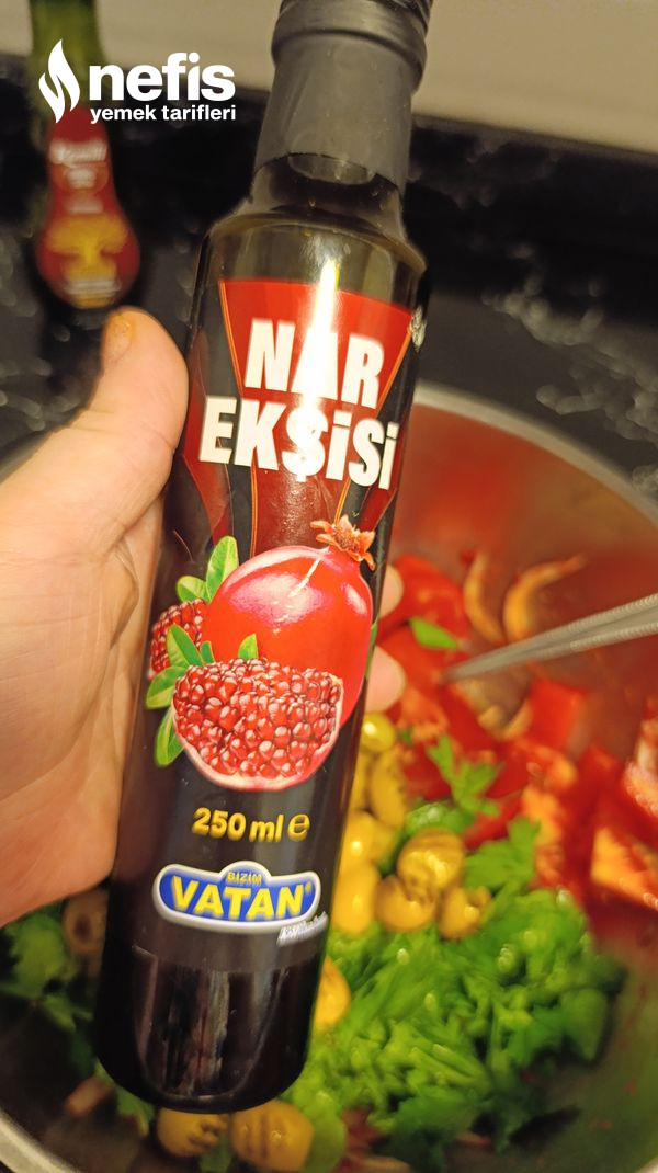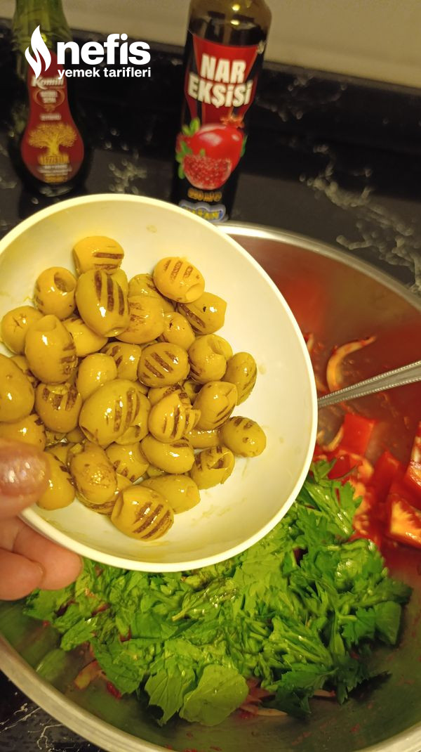 - Üzerine yeşil zeytin, tuz,nar ekşisi, 1 yemek kaşığı zeytinyağı daha ekleyip, karıştırıyoruz. Servis tabağına alıyoruz. Afiyet olsun👌🤗
