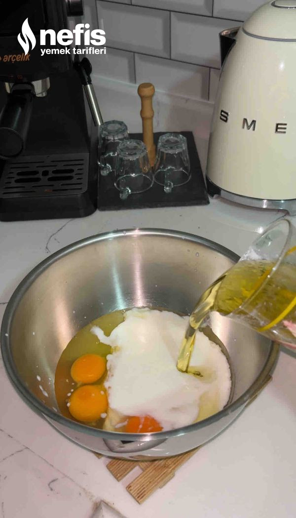 3. 1 su bardağı sıvı yağ döküyoruz ve çırpıyoruz.