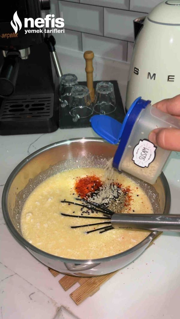 5. Unu, kabartma tozunu ve baharatları döküyoruz, tekrar karıştırıyoruz.