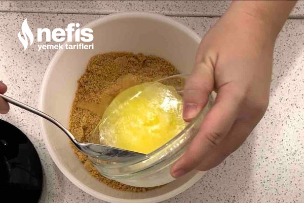 - Tereyağını eritin. Bisküvileri rondodan geçirin. Boş bir kasede bisküviler ile tereyağını karıştırın.