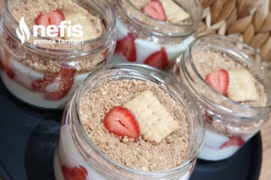 7. Cuplarımıza sırasıyla bisküvimizi, kremamızı ve meyve dilimlerimizi istediğimiz üzere servis edelim.