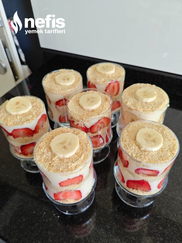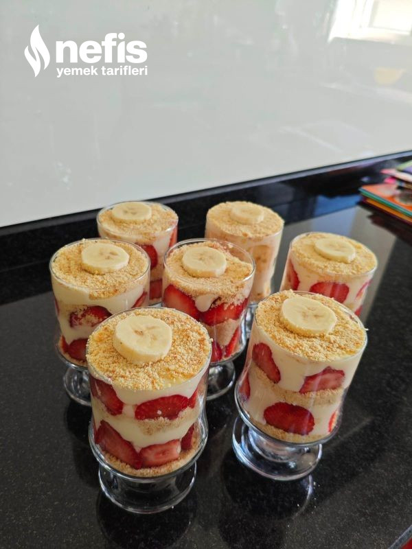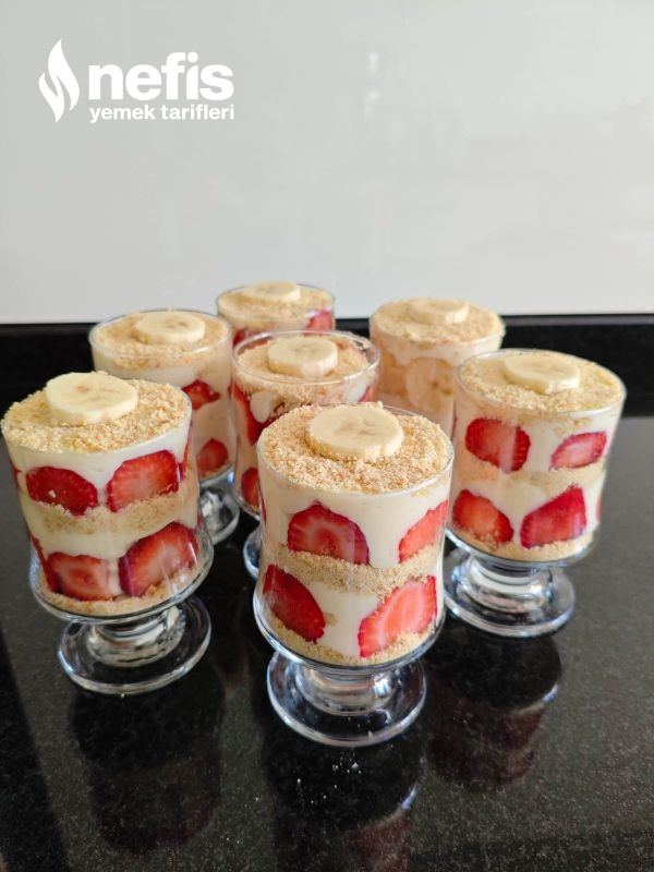 - Kullanacağımız kupların tabana evvel bisküvileri hisse edelim çilekleri ince ince dilimleyip kupların etrafına dizelim .